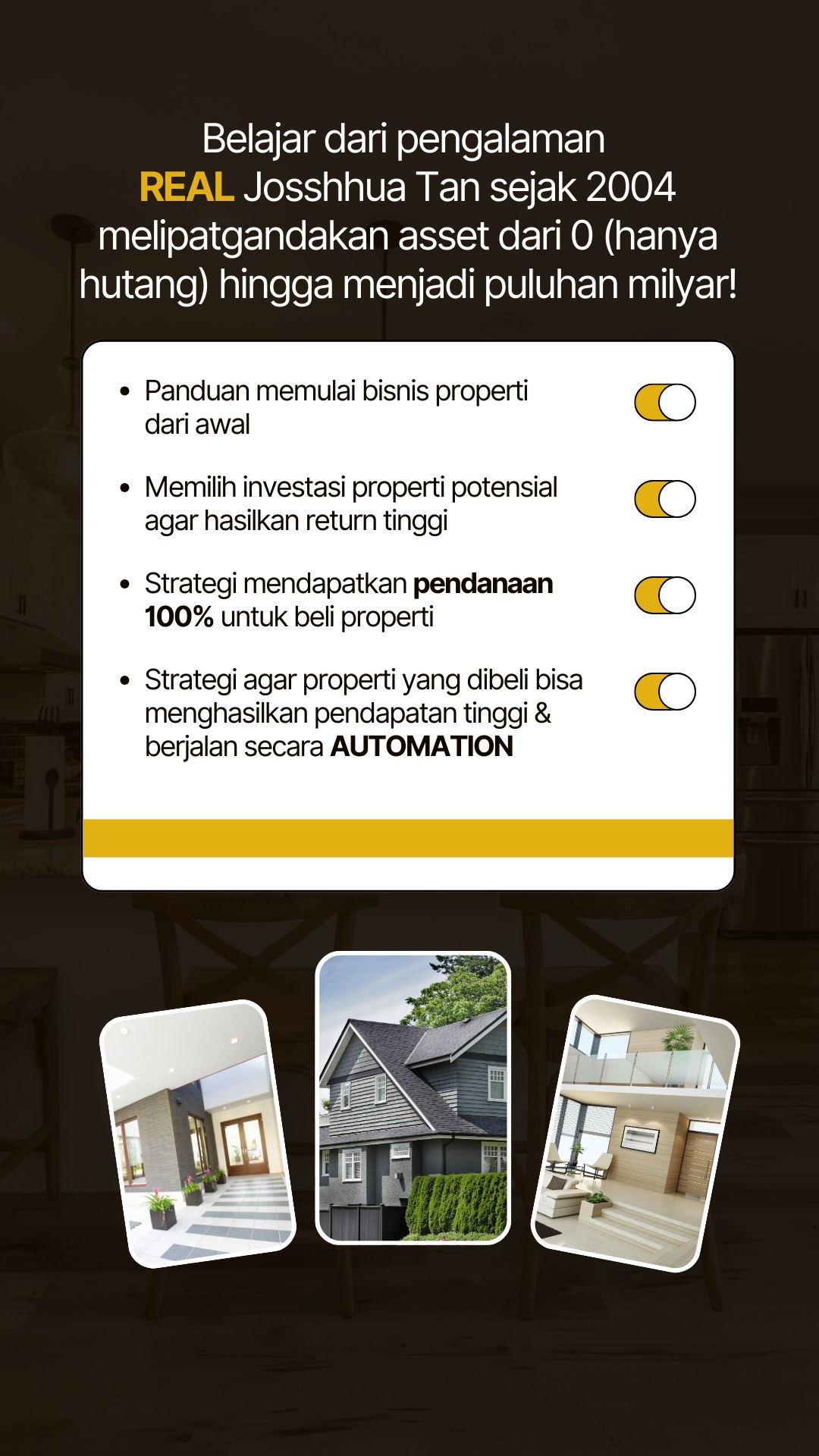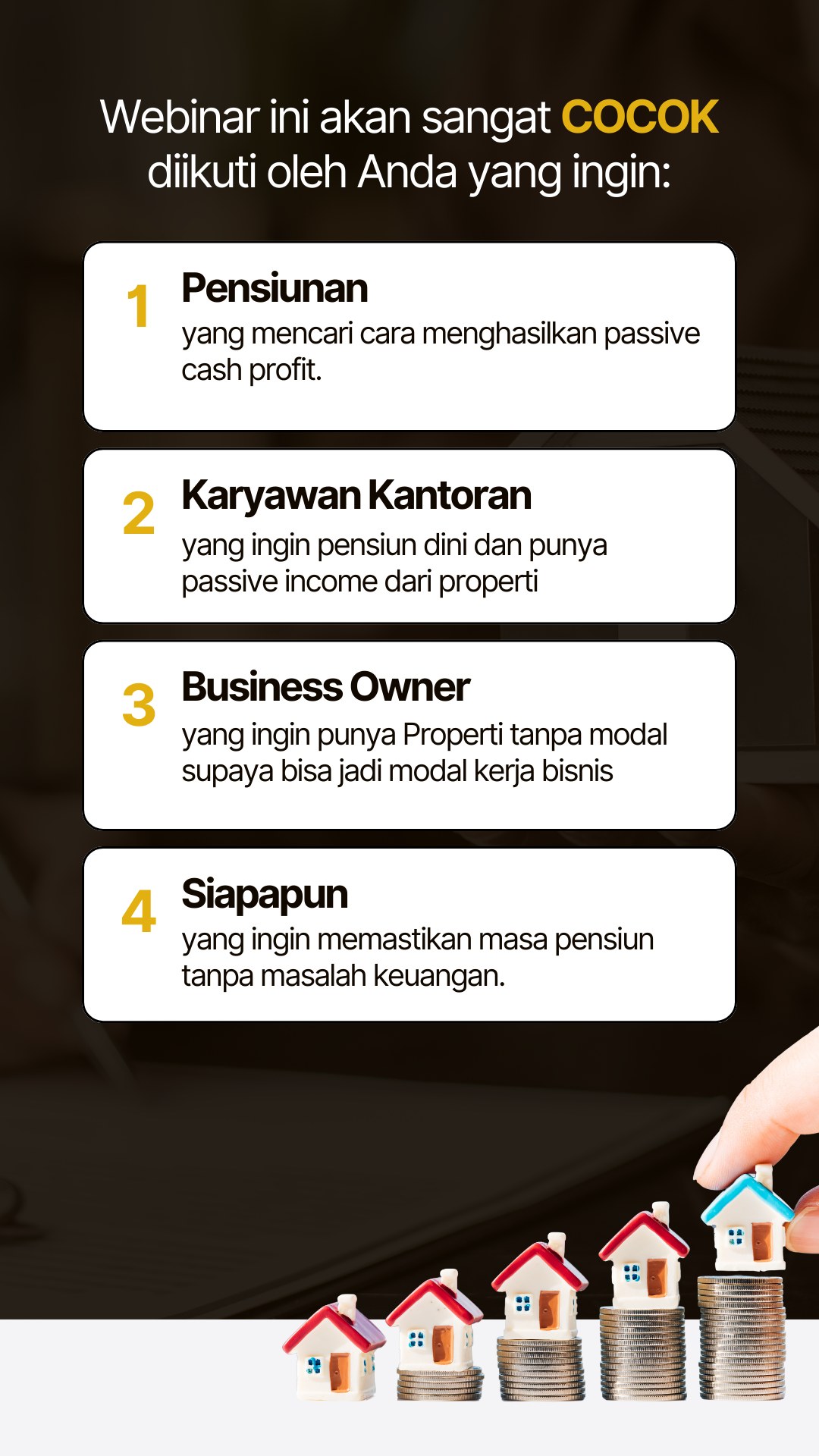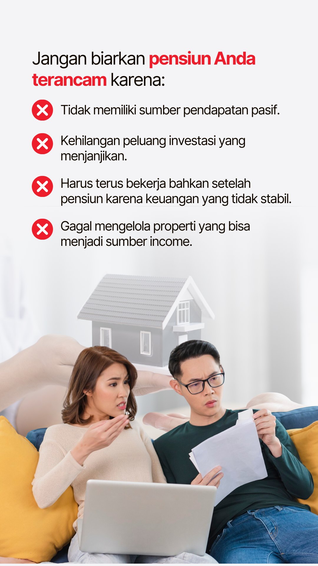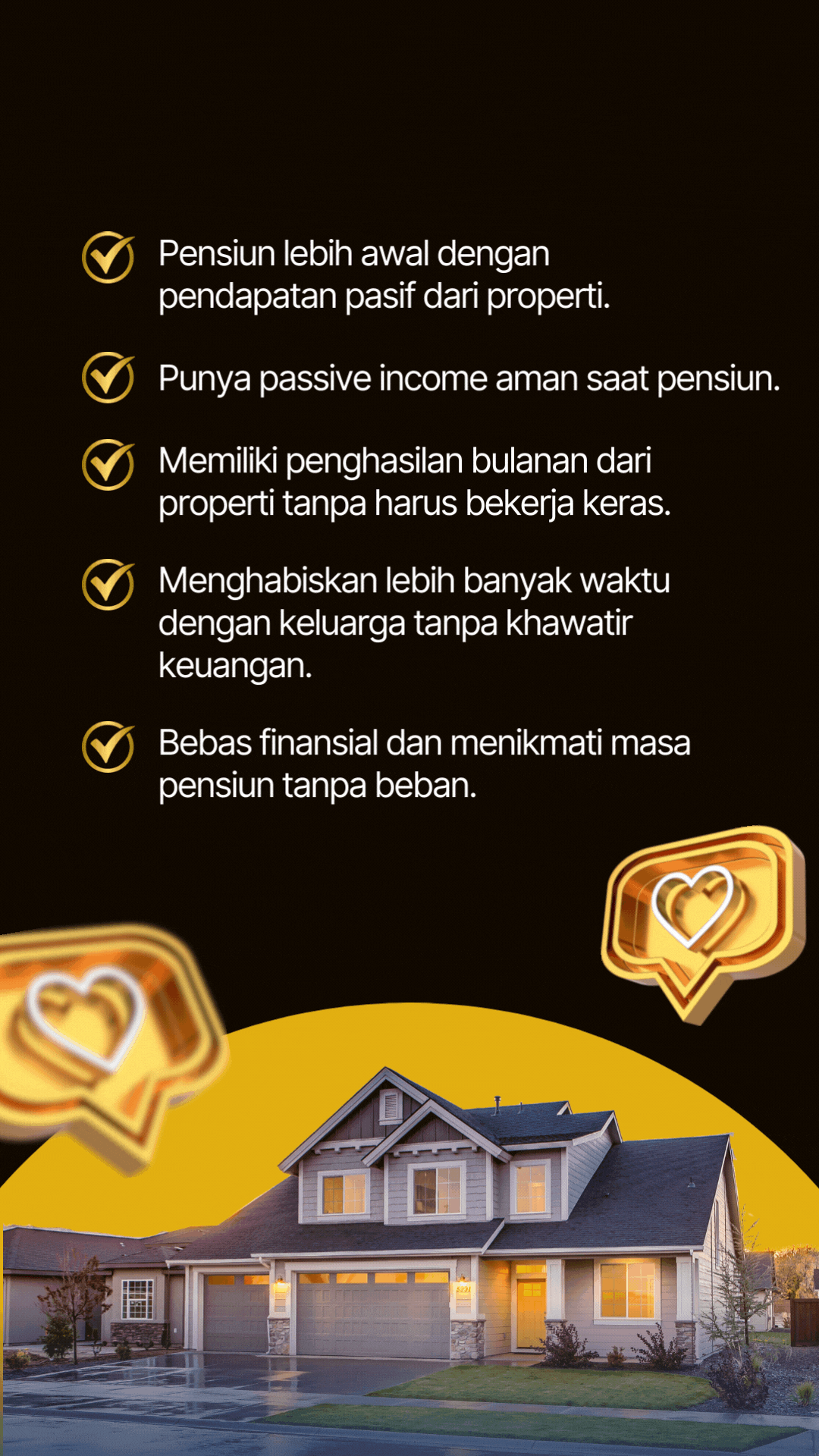 Pelajari cara memulai investasi properti untuk menghasilkan Passive Cash Profit dengan sistem AUTOMATION agar masa pensiun Anda menjadi lebih nyaman, sejahtera & bebas khawatir